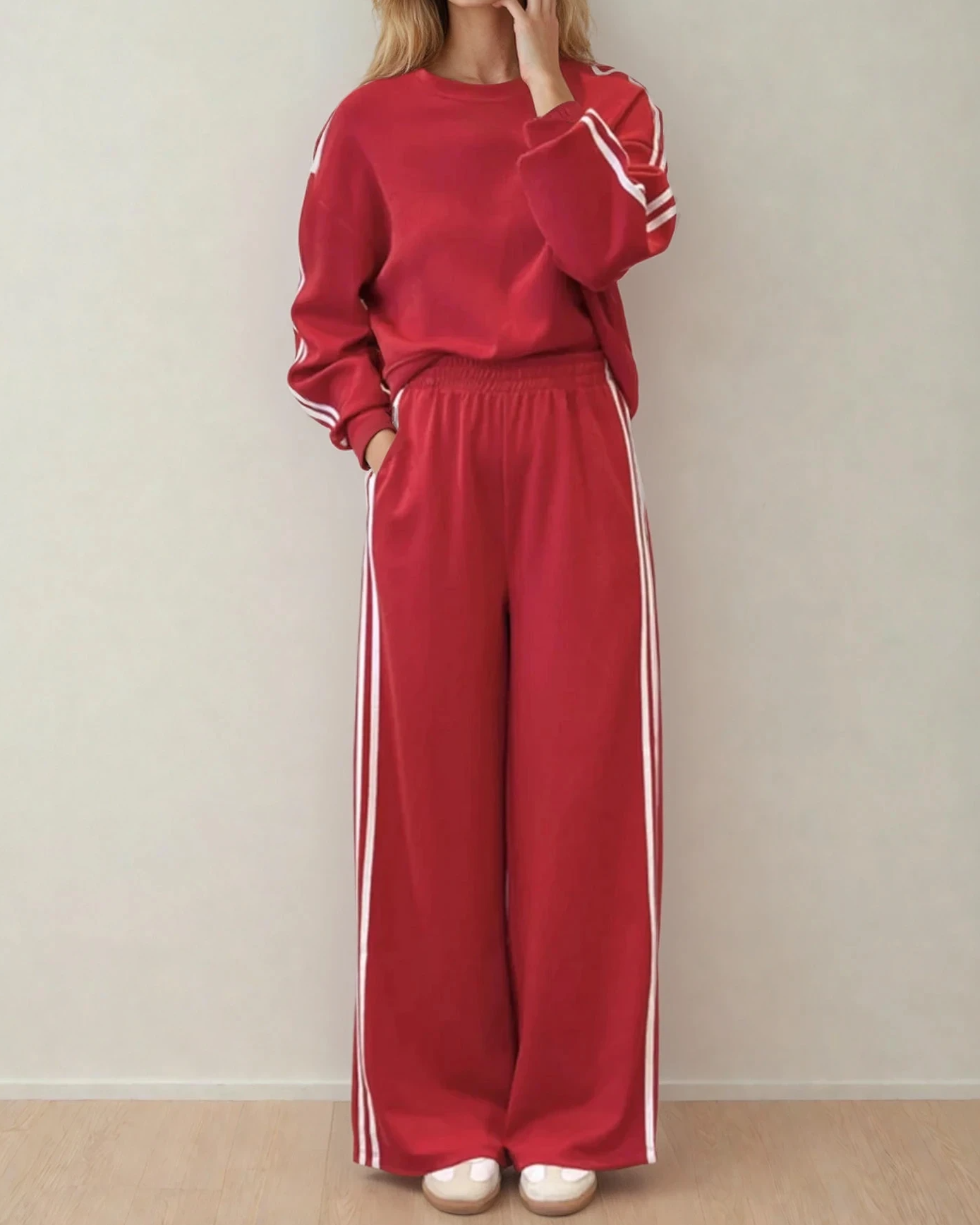 Varsity Pullover Wide Leg Pants 2pcs Outfit - Red | Dropship