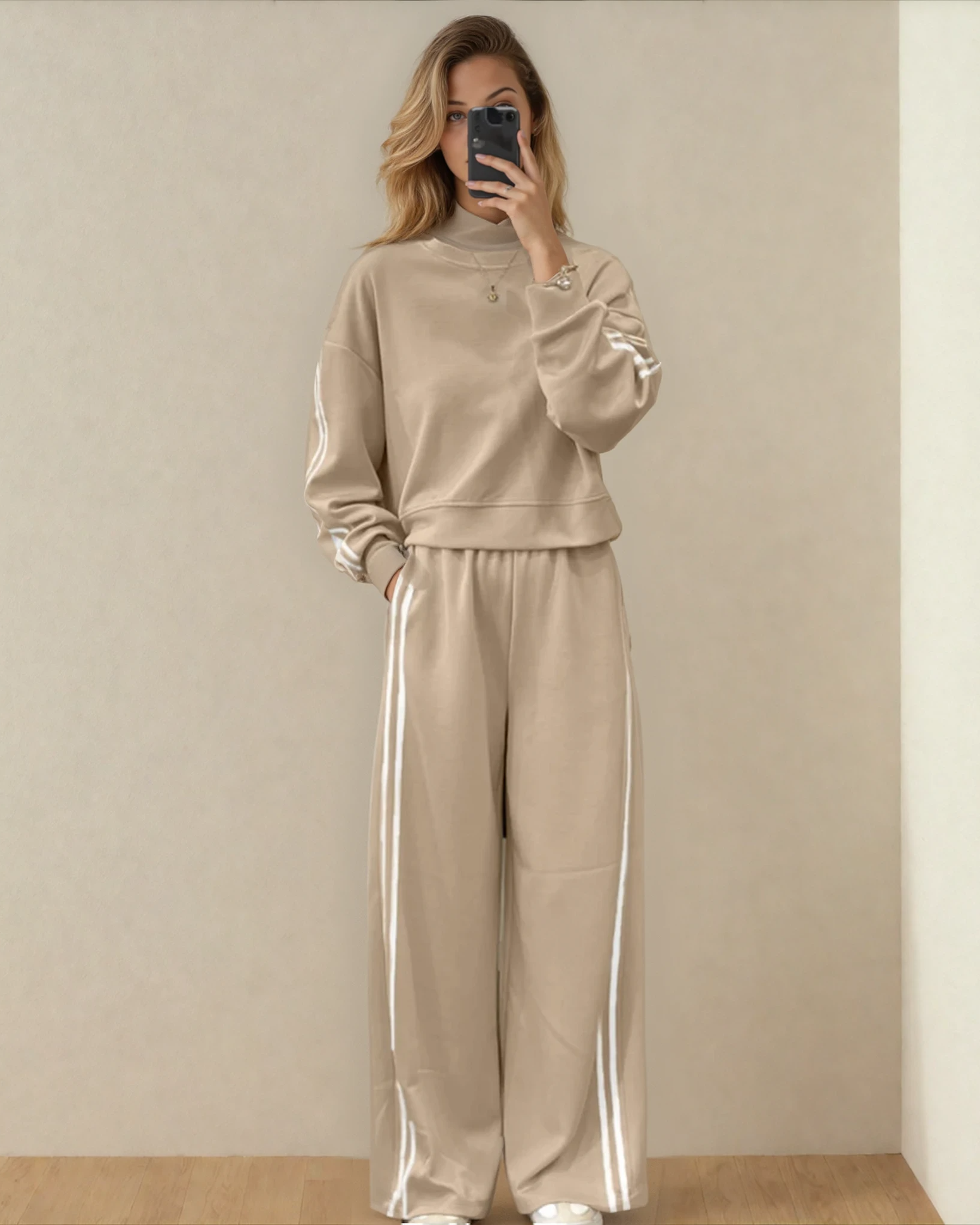 Varsity Pullover Wide Leg Pants 2pcs Outfit - Oatmeal | Dropship