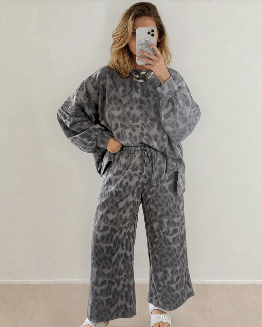PREORDER Reese Leopard Print Pullover Drawstring Loose Pants Set - Gray | Dropship