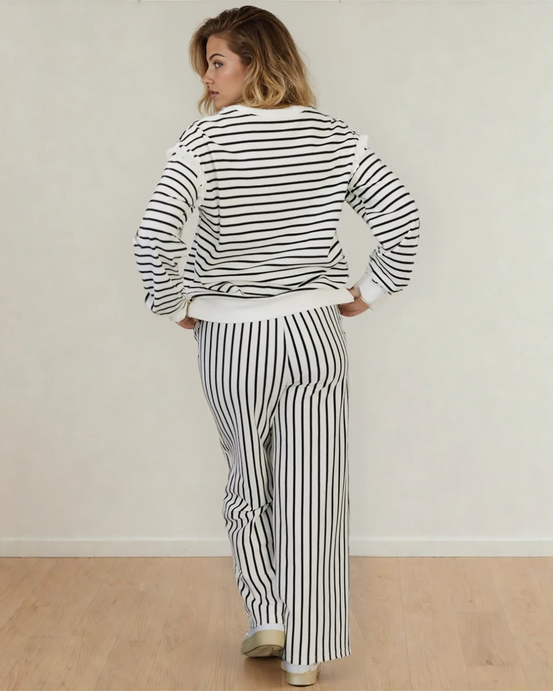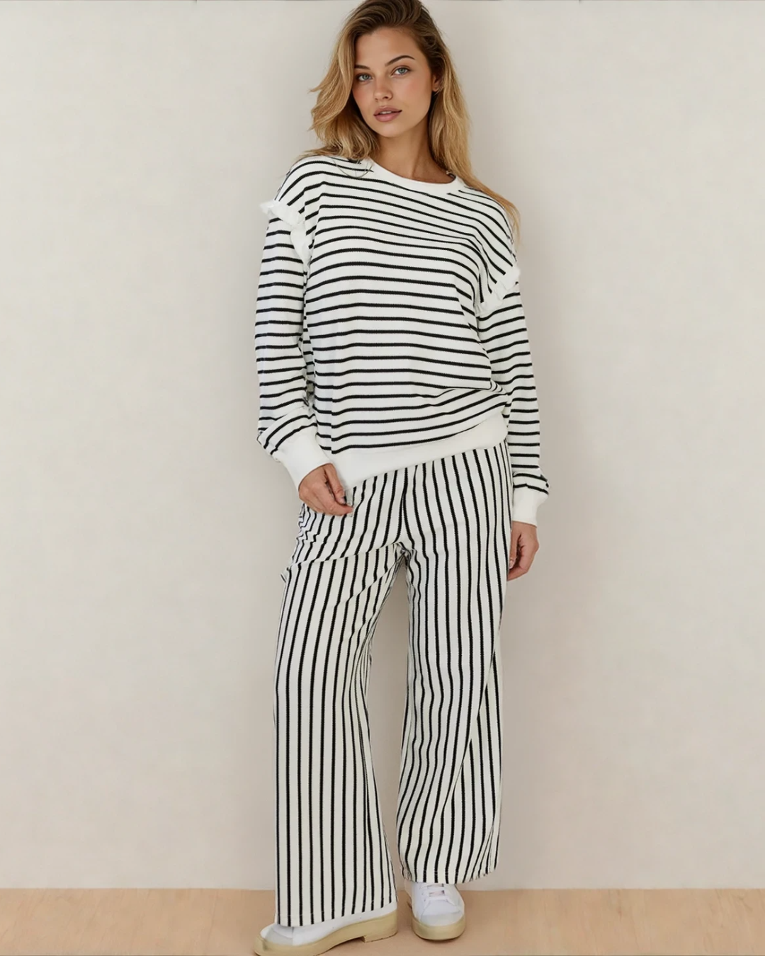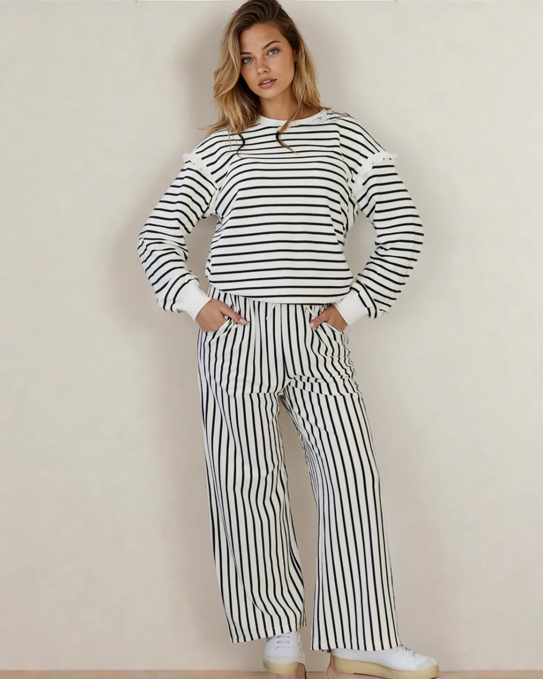 PREORDER Talia Stripe Ruffle Trim Drop Shoulder Top Drawstring Loose Pant Set | Dropship