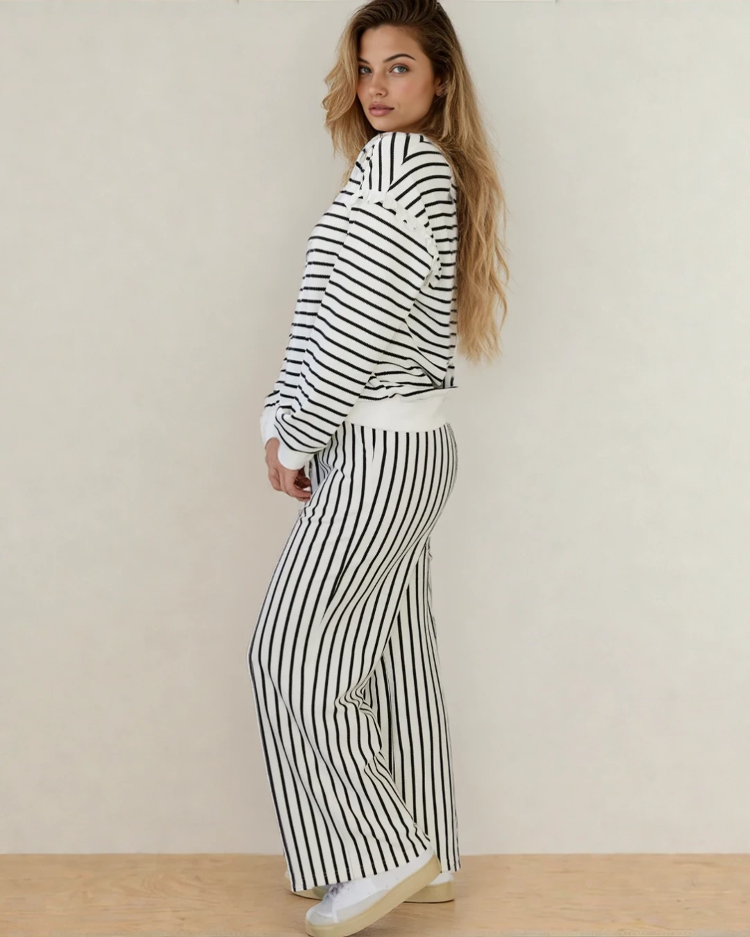 Includes a trendy long sleeve top and flowy wide leg pants.