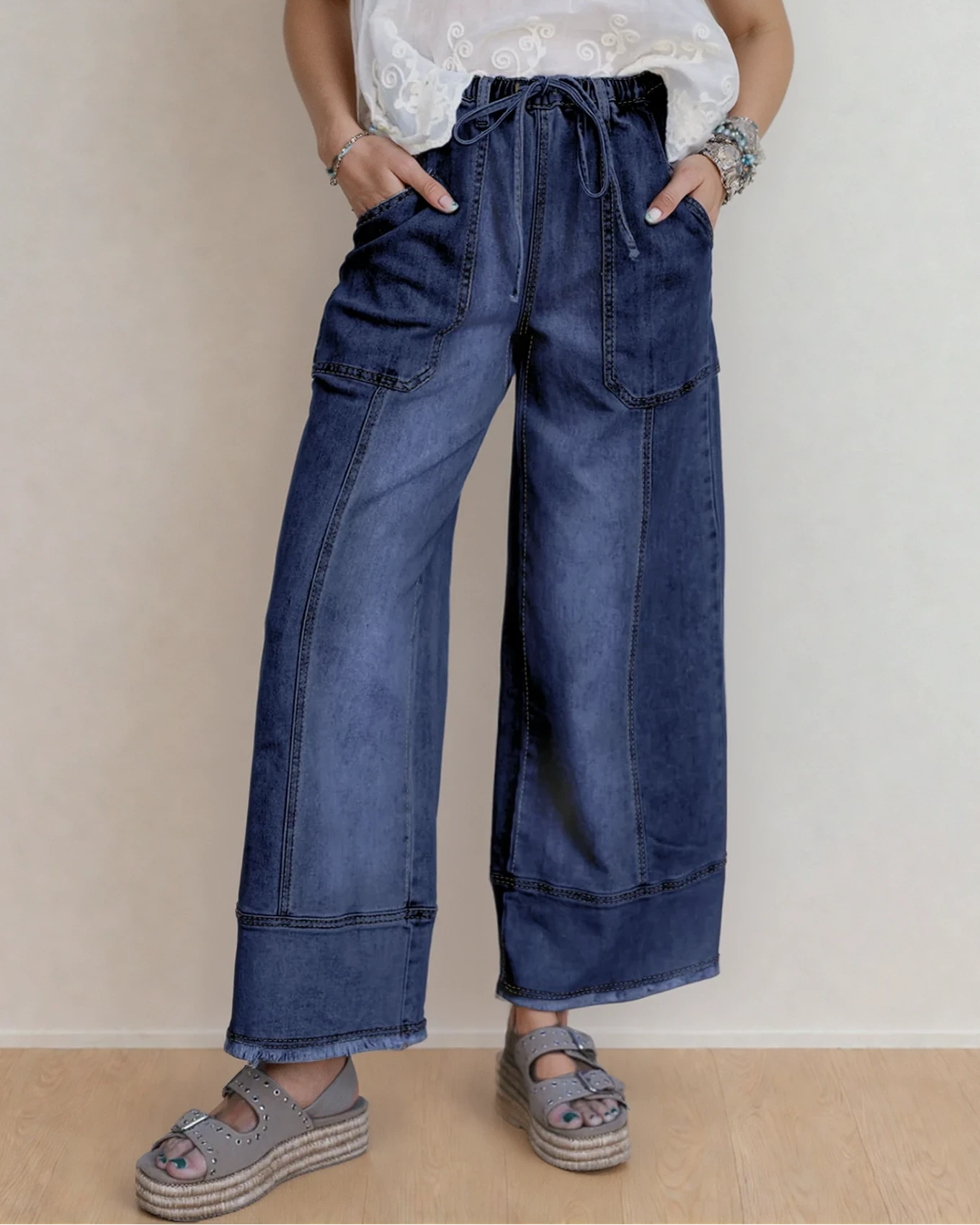 Beau Blue Drawstring Seam Detail Raw Hem Wide Leg Jeans - Dark Wash | Dropship