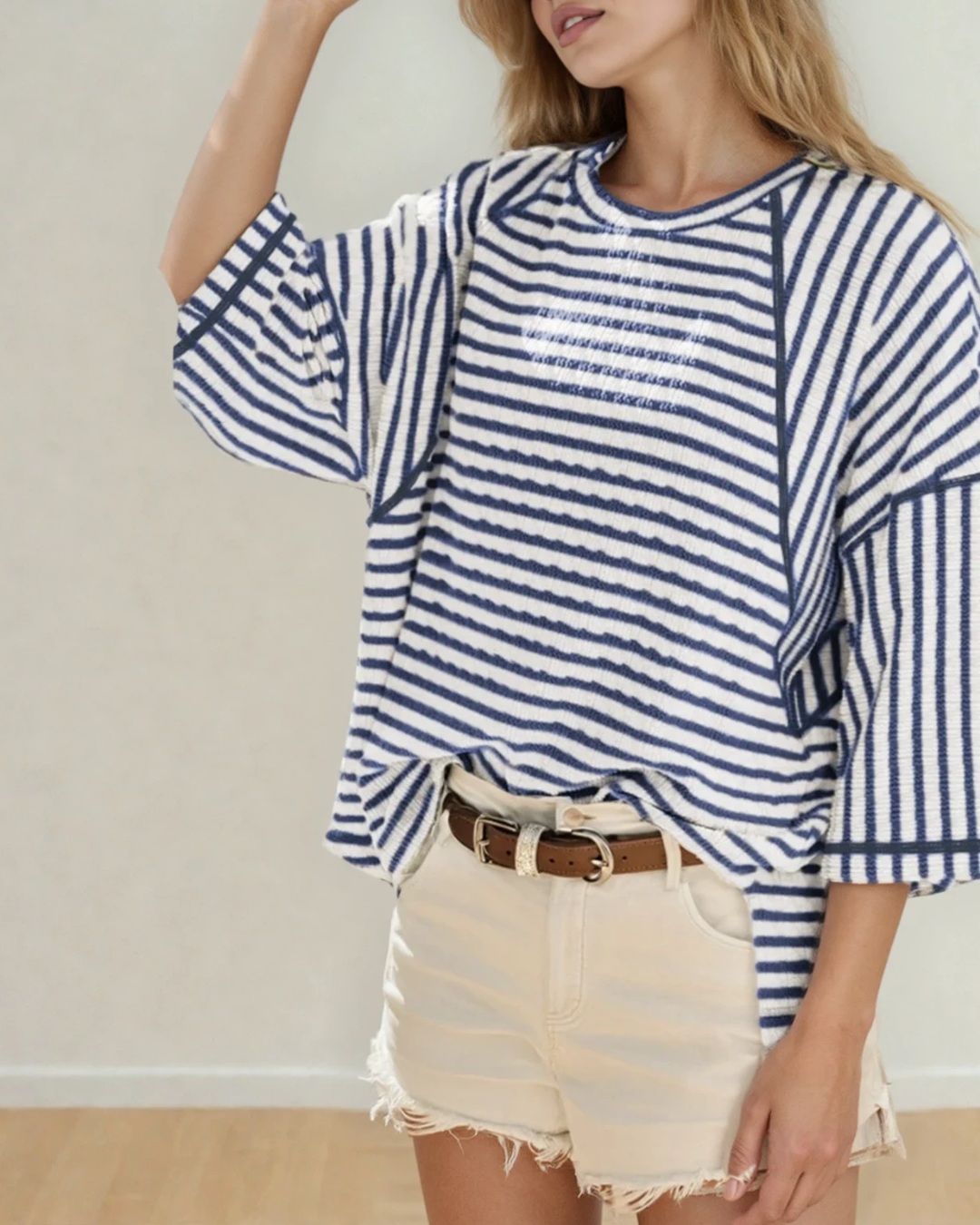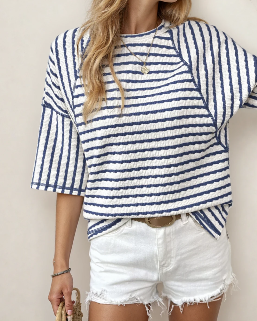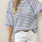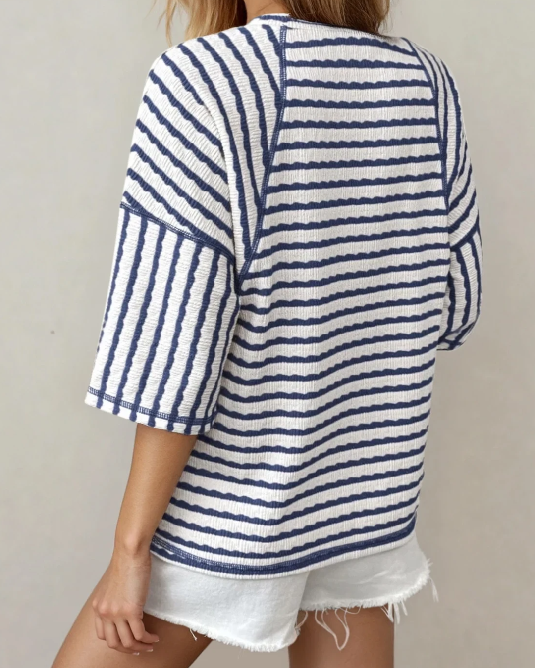 Noelle Textured Knit Split Hem Half Sleeve Loose Top - Blue