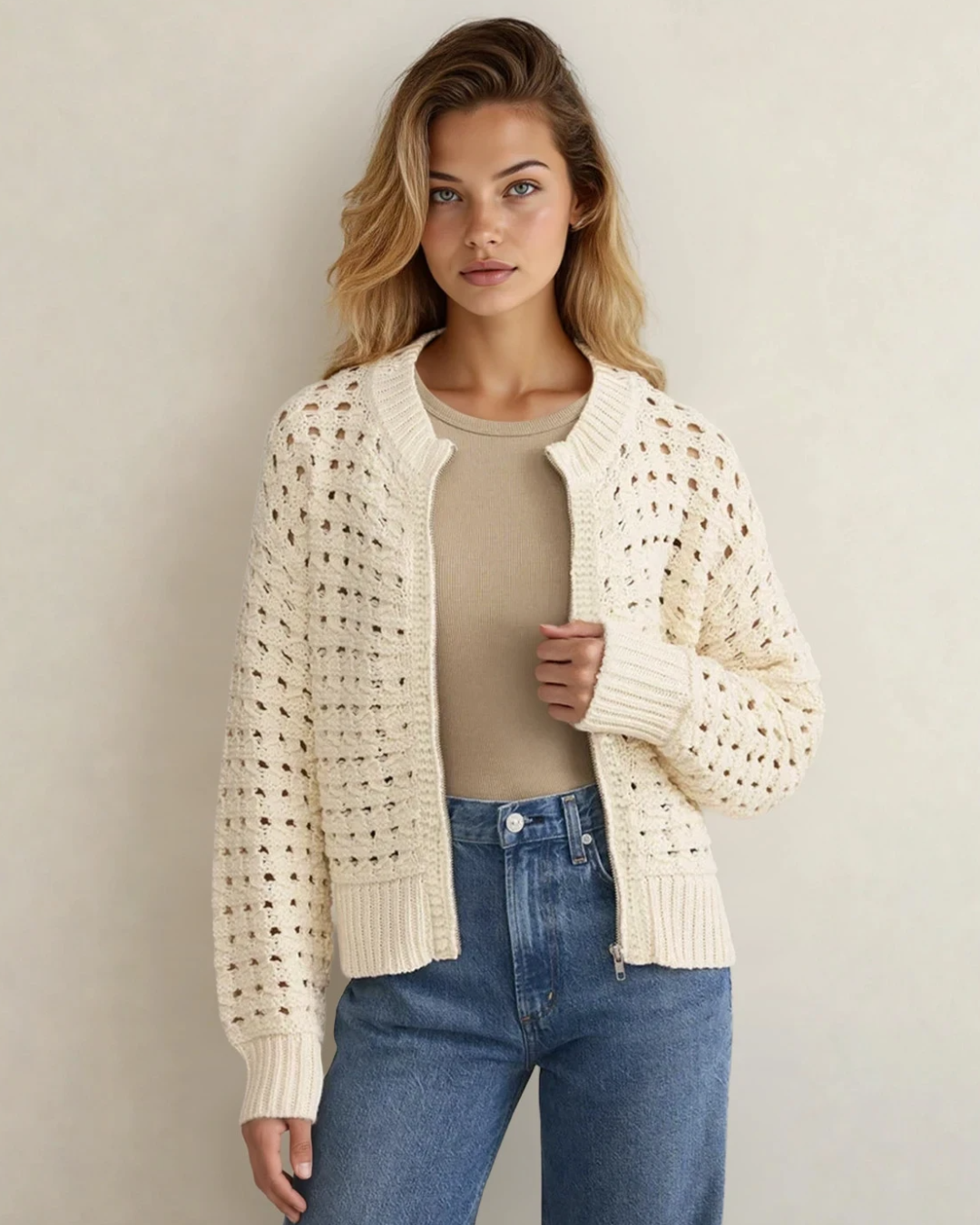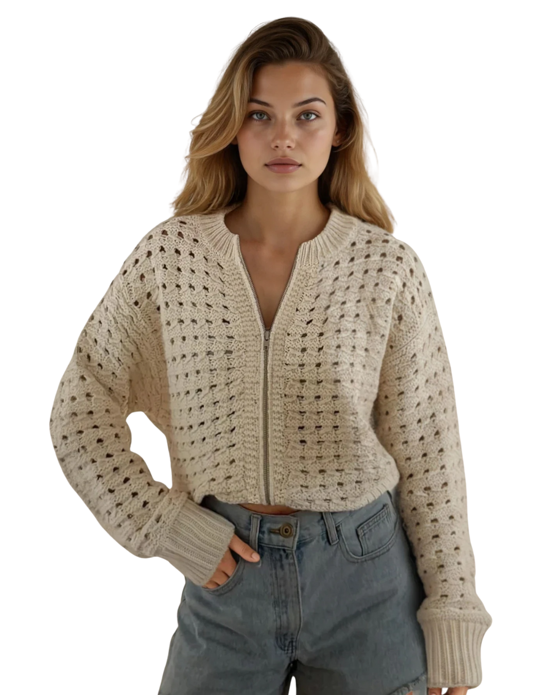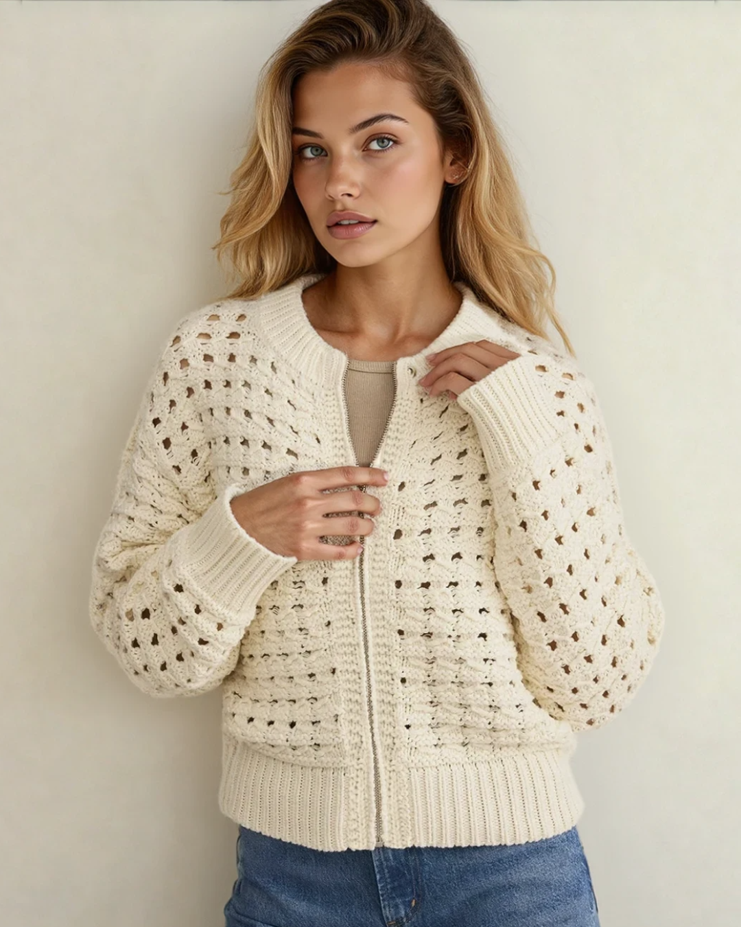 PREORDER Esther Hollowed Pattern Knit Zip Up Drop Shoulder Cardigan | Dropship