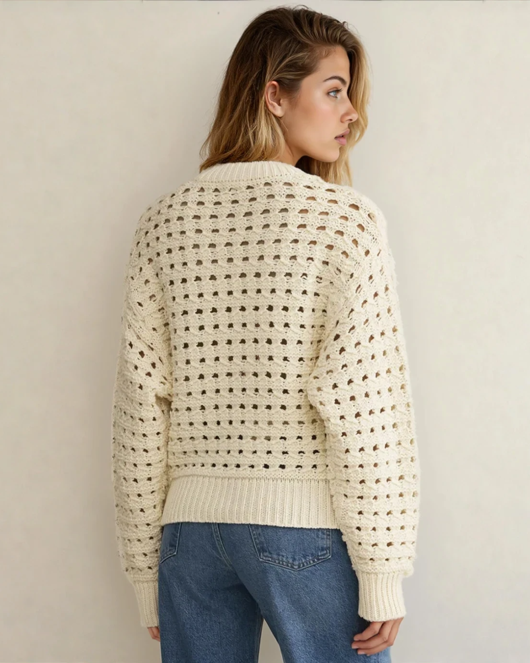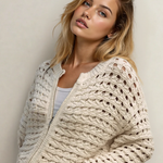 • This soft knit cardigan with a unique hollowed pattern for a chic and contemporary look.