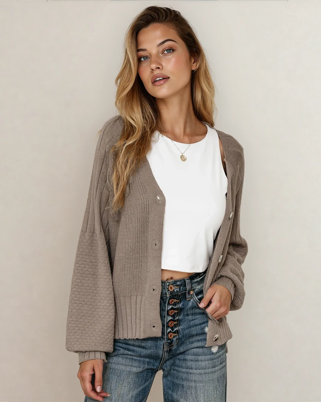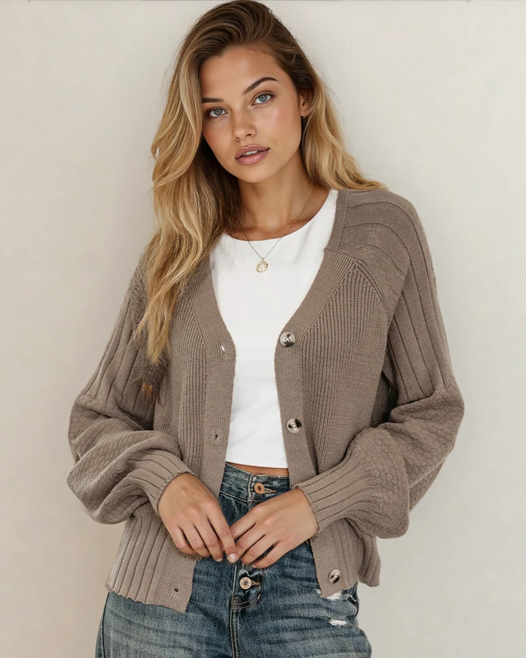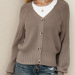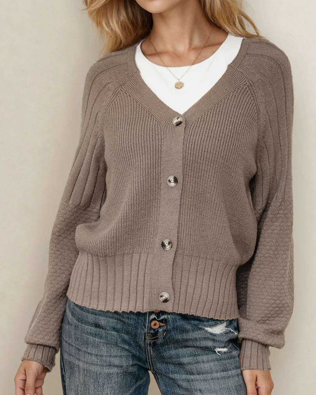 PREORDER Jane Mixed Texture Knit Button V Neck Sweater Cardigan - Brown | Dropship