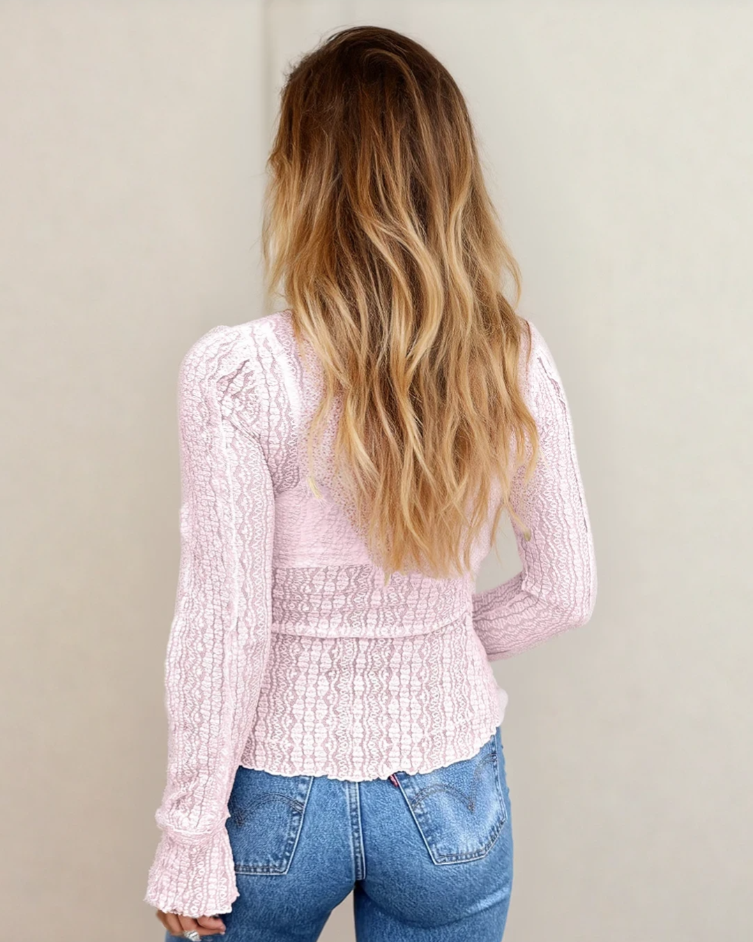 Flounced long sleeves bring feminine detail to this lace blouse.