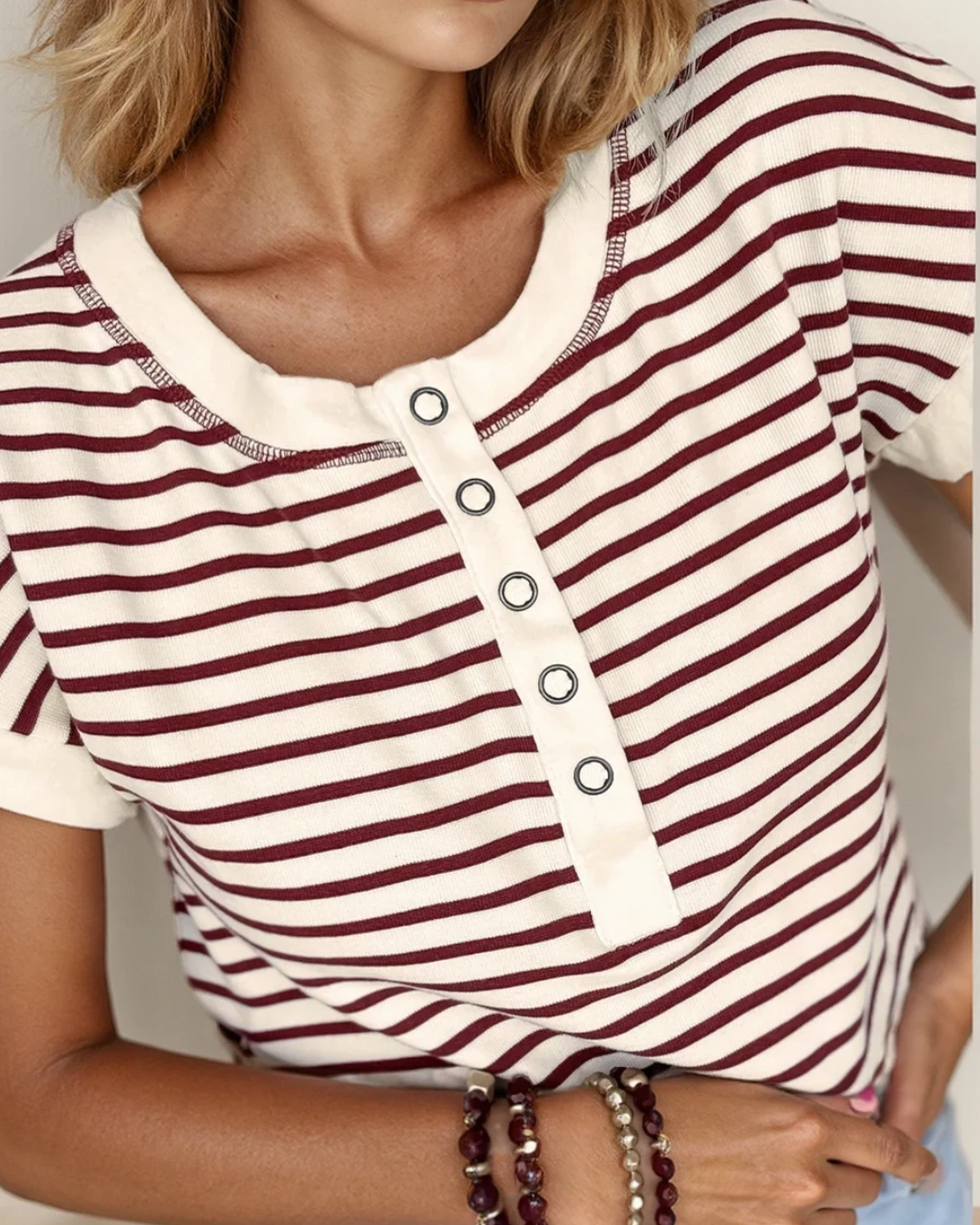 - Casual striped T-shirt with a classic round neck and half-button detail.