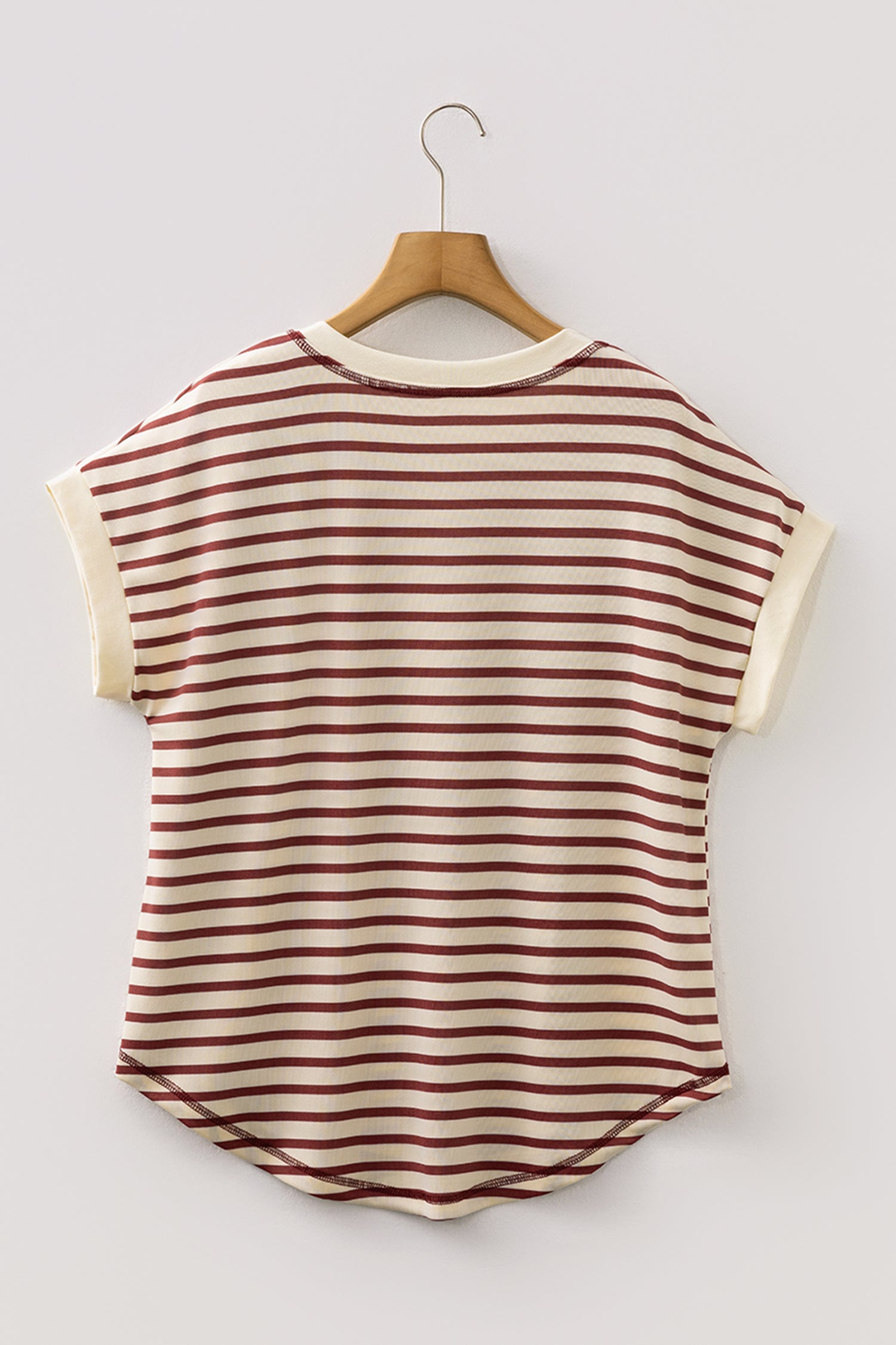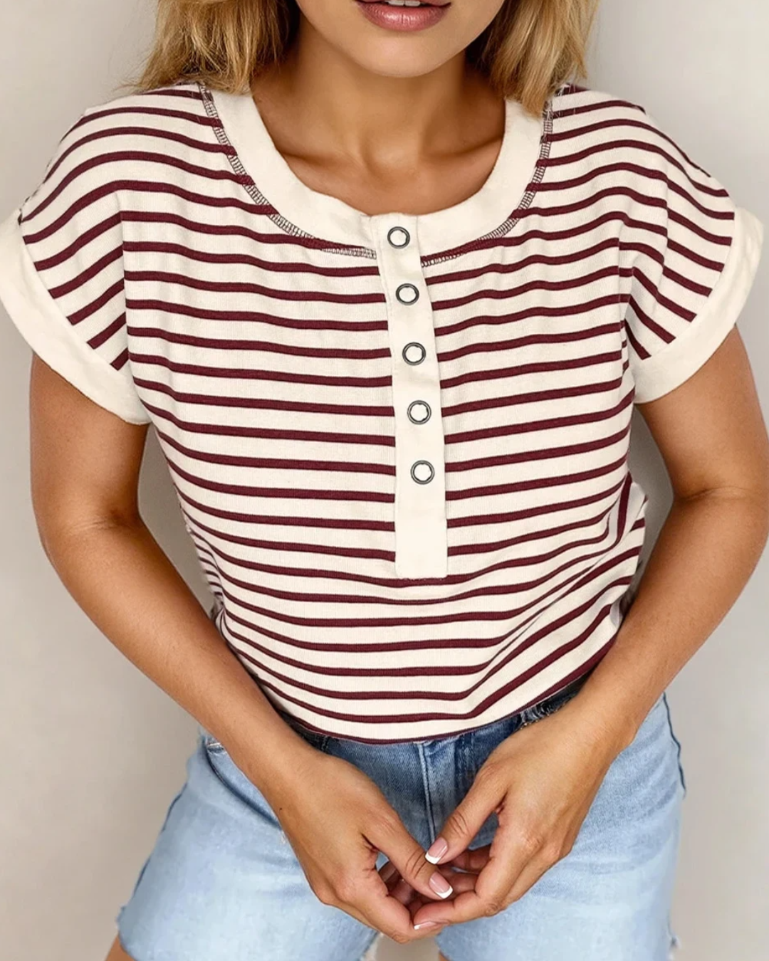 PREORDER Maisie Stripe Half Buttons Round Neck T Shirt - Red | Dropship