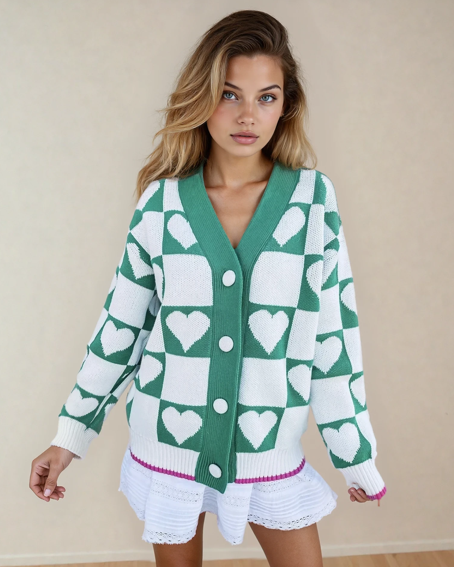 - This plaid heart knit cardigan is a perfect layering for the holiday season.