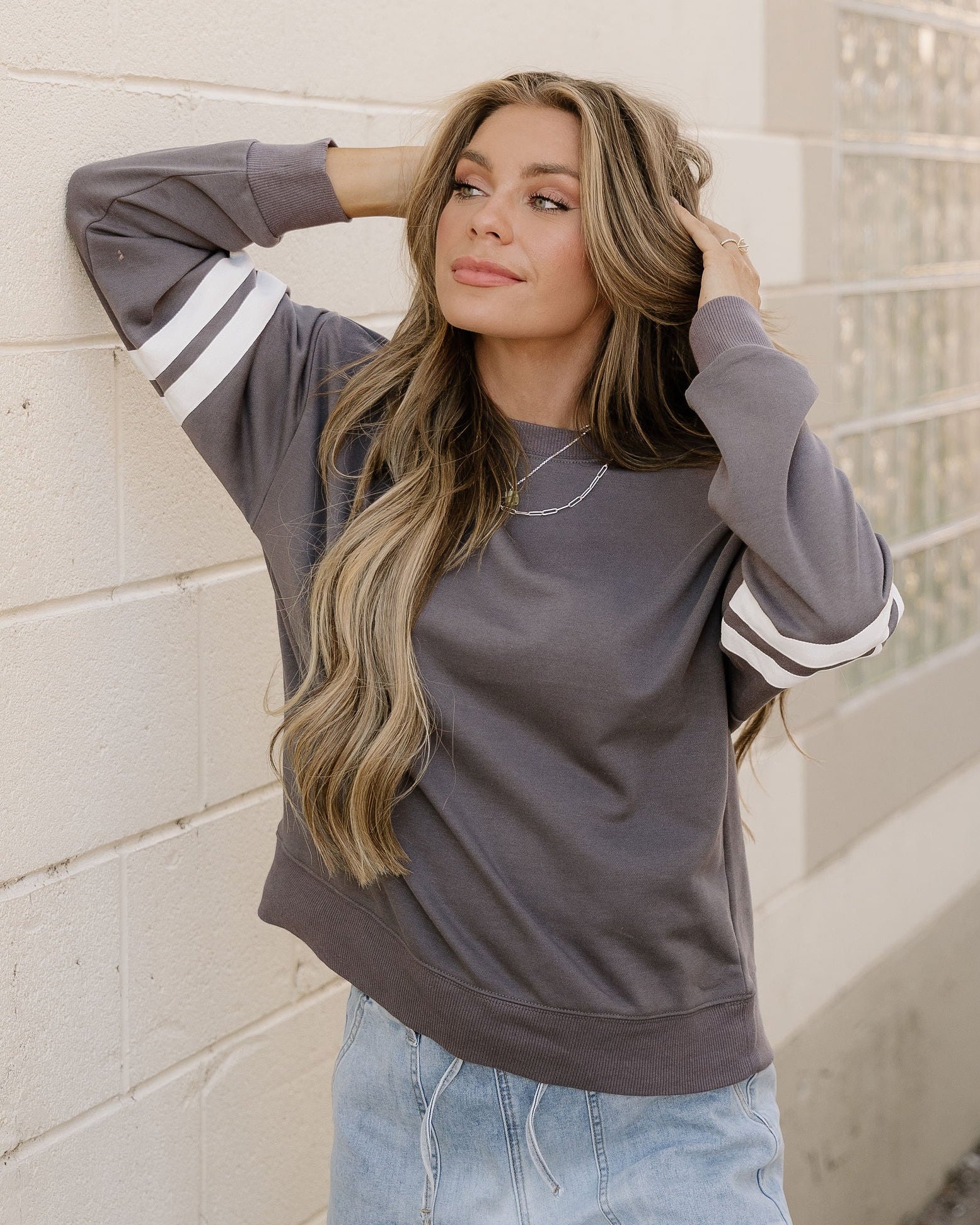 Varsity Striped Sleeve Loose Sweatshirt - Dark Gray | Dropship