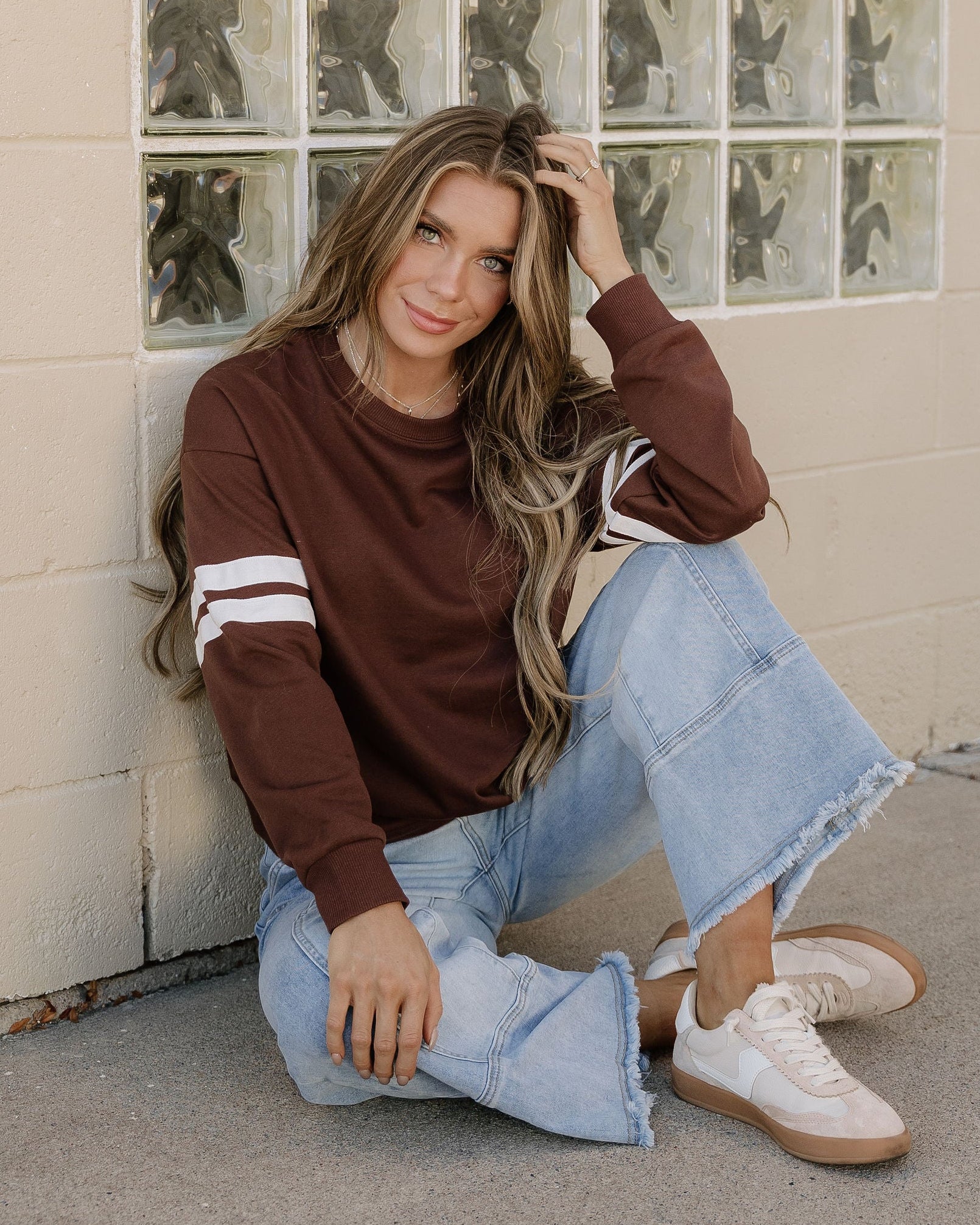 Varsity Striped Sleeve Loose Sweatshirt - Coffee | Dropship