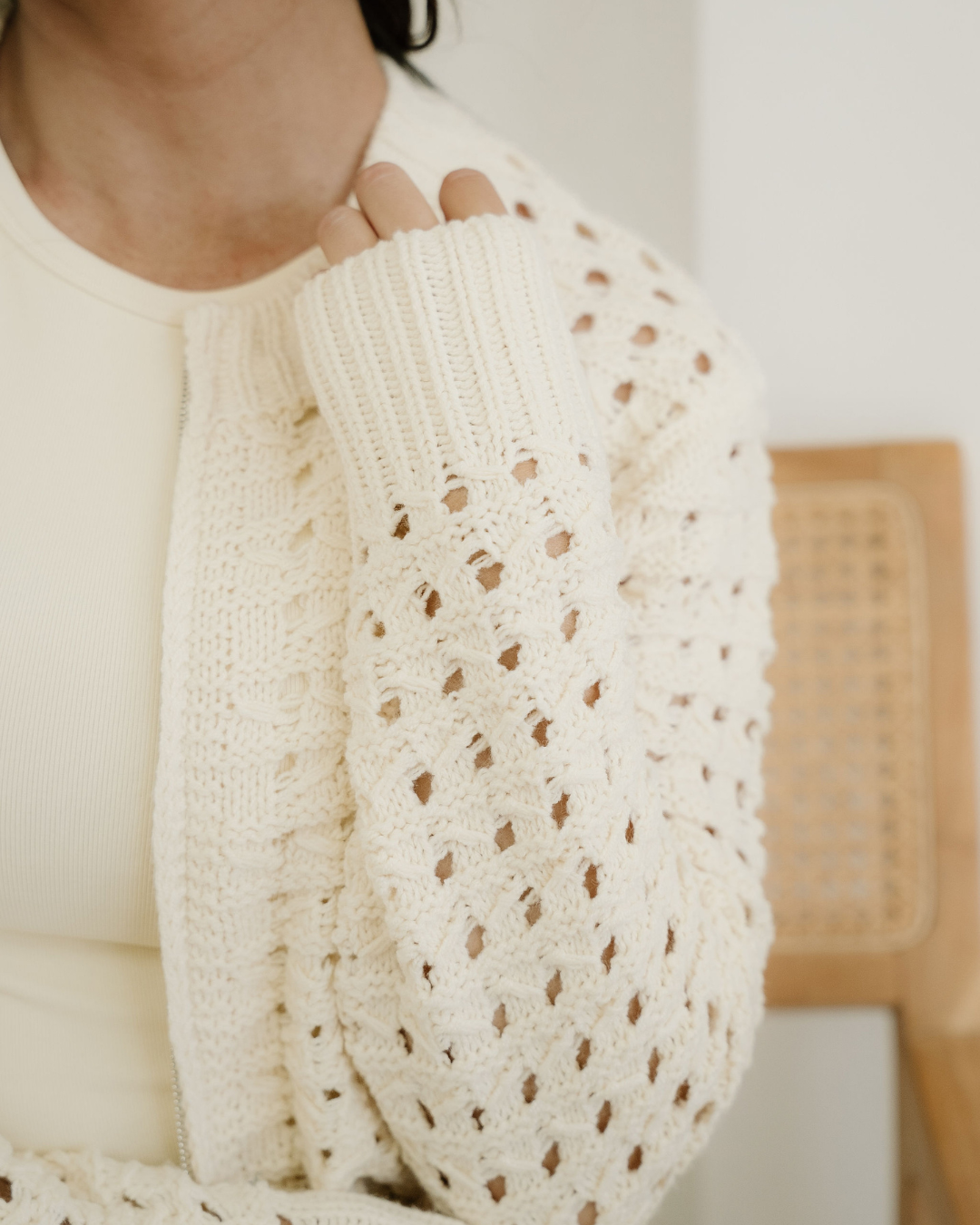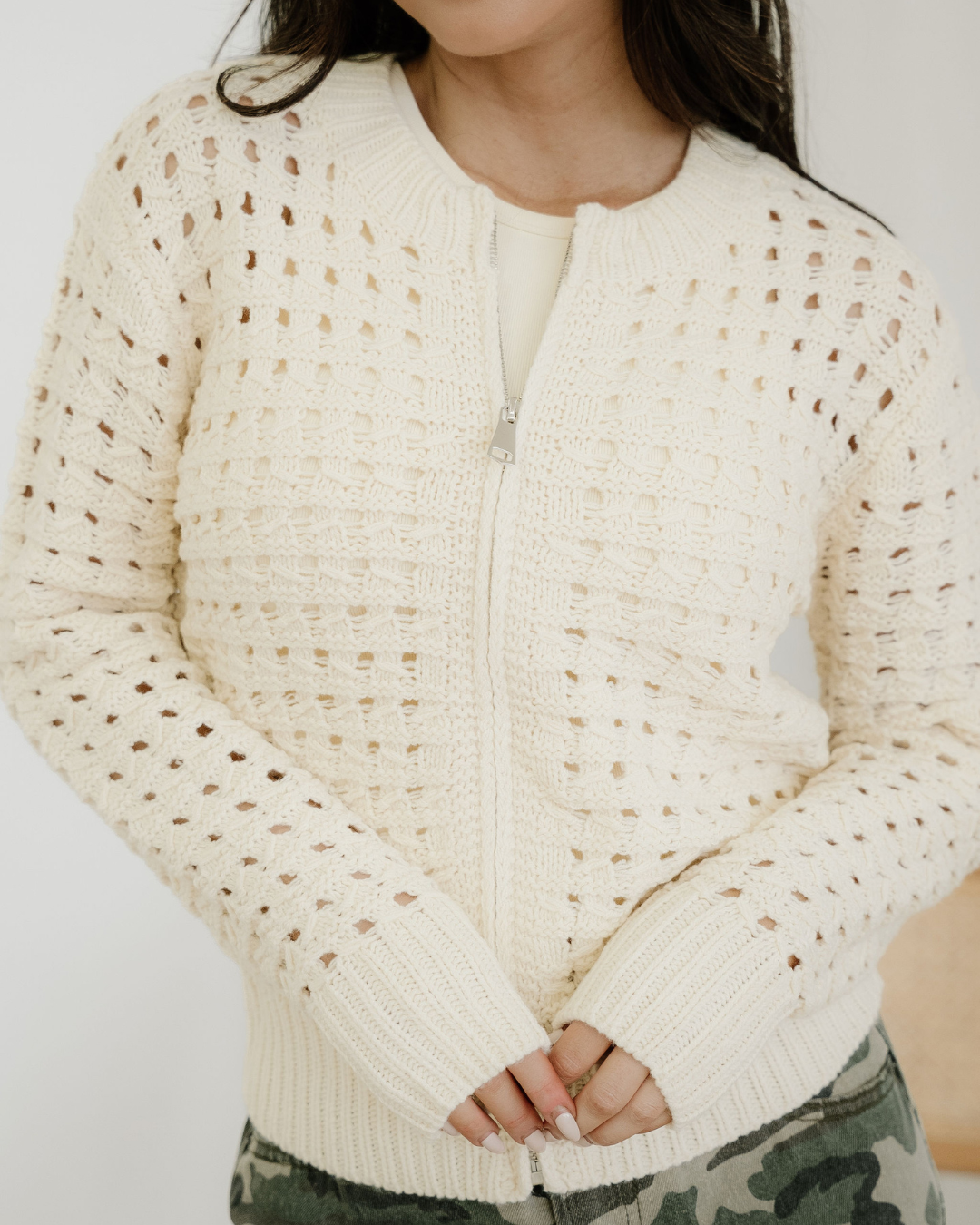 Esther Hollowed Pattern Knit Zip Up Drop Shoulder Cardigan