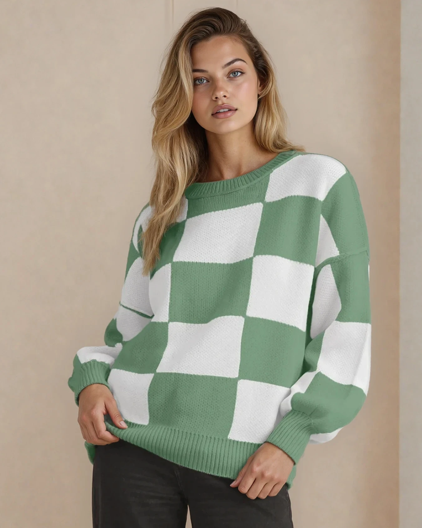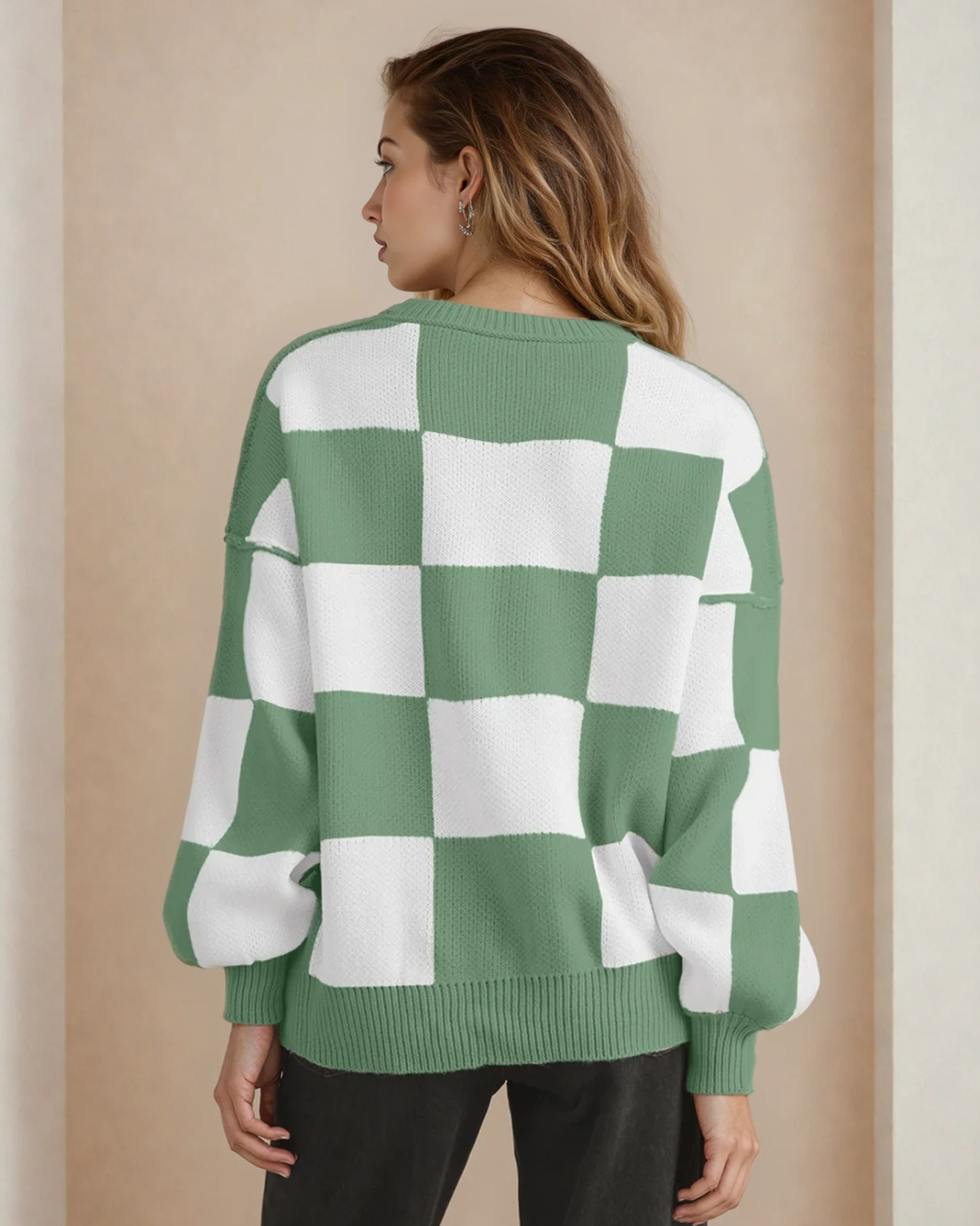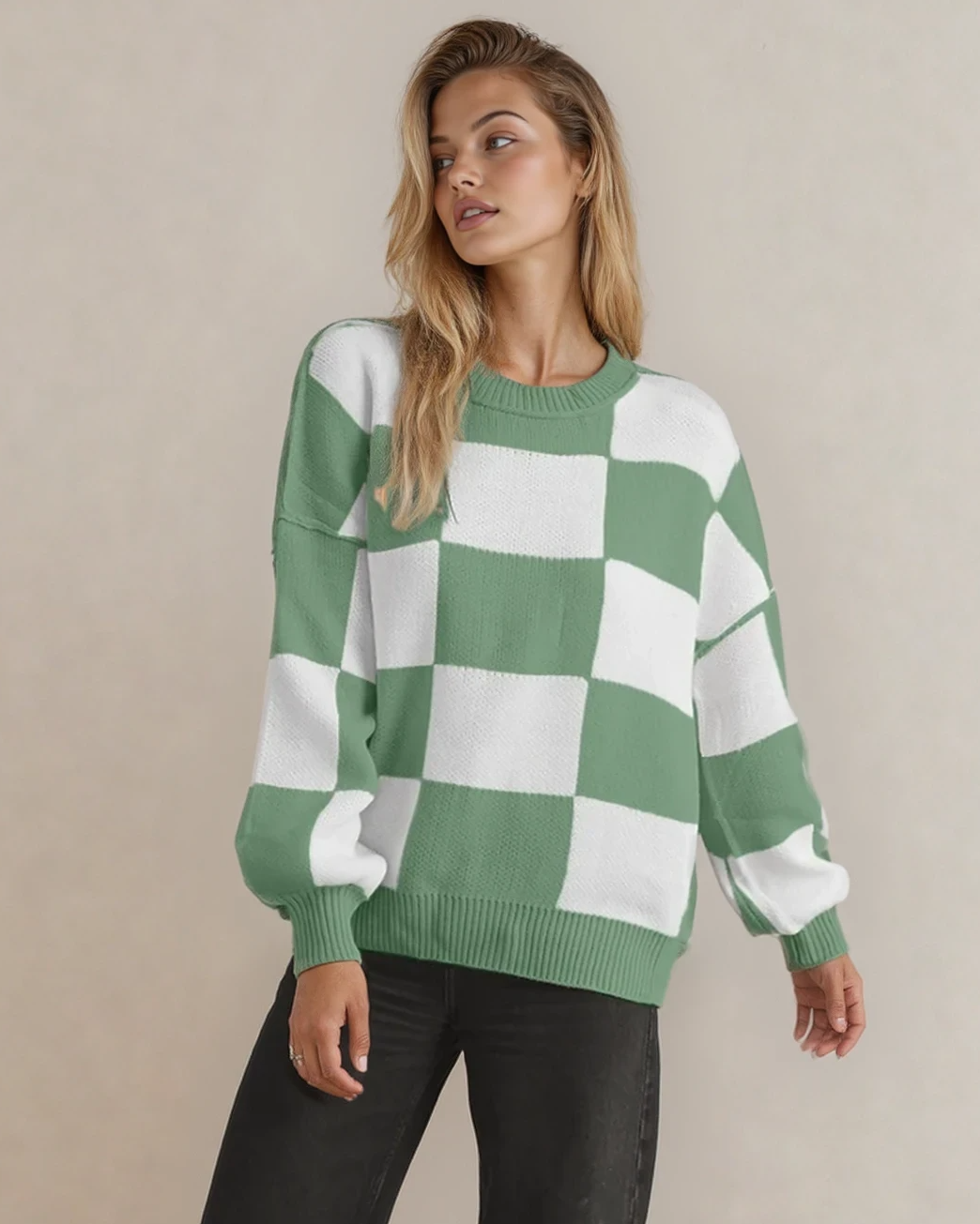 - This pullover sweater features a cozy plaid design and stylish bishop sleeves, perfect for a chic winter look.