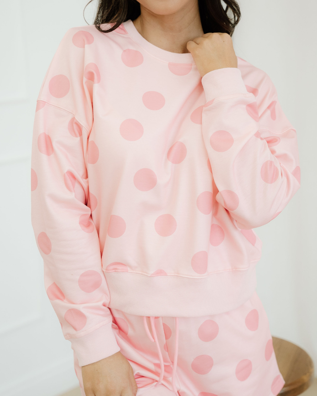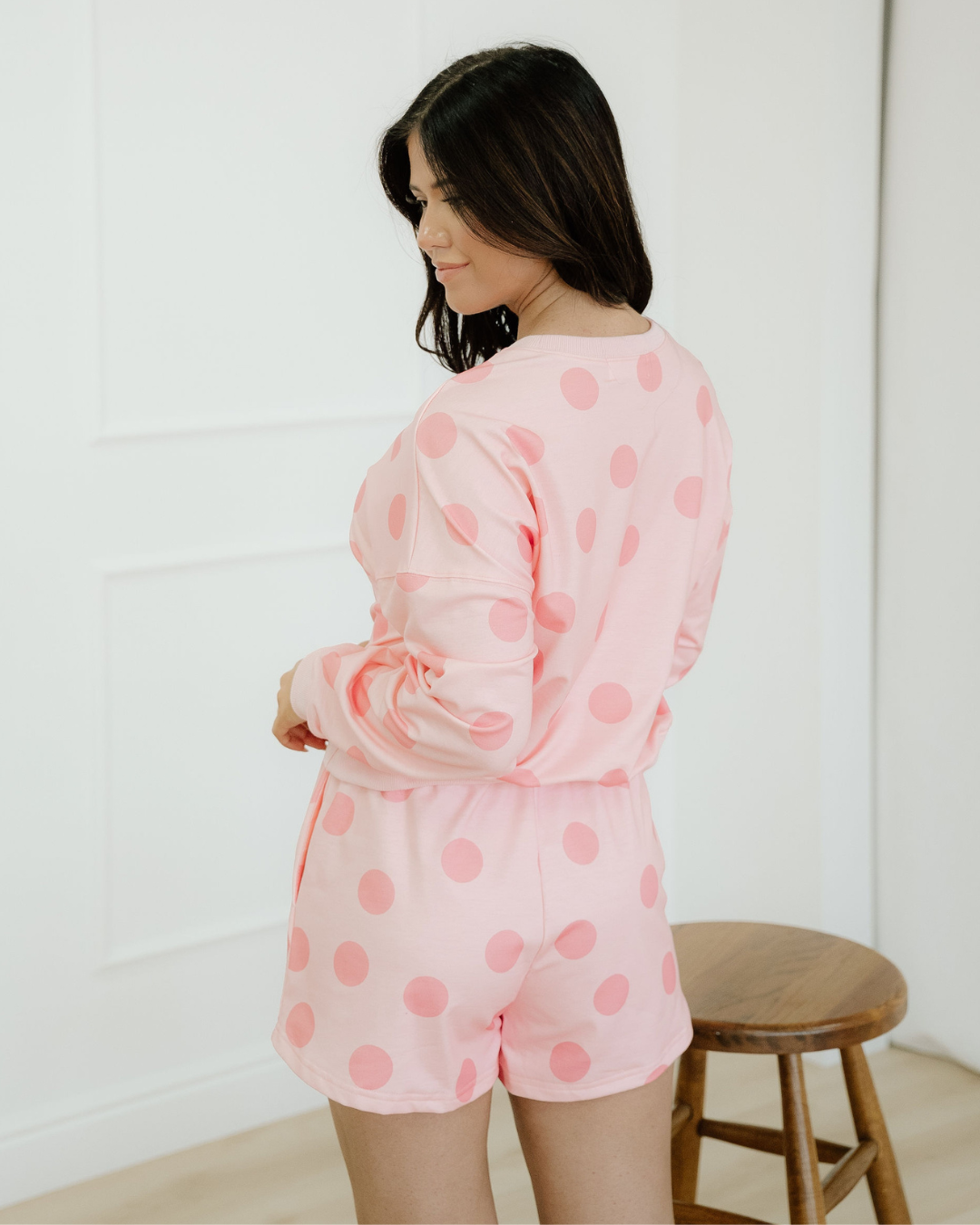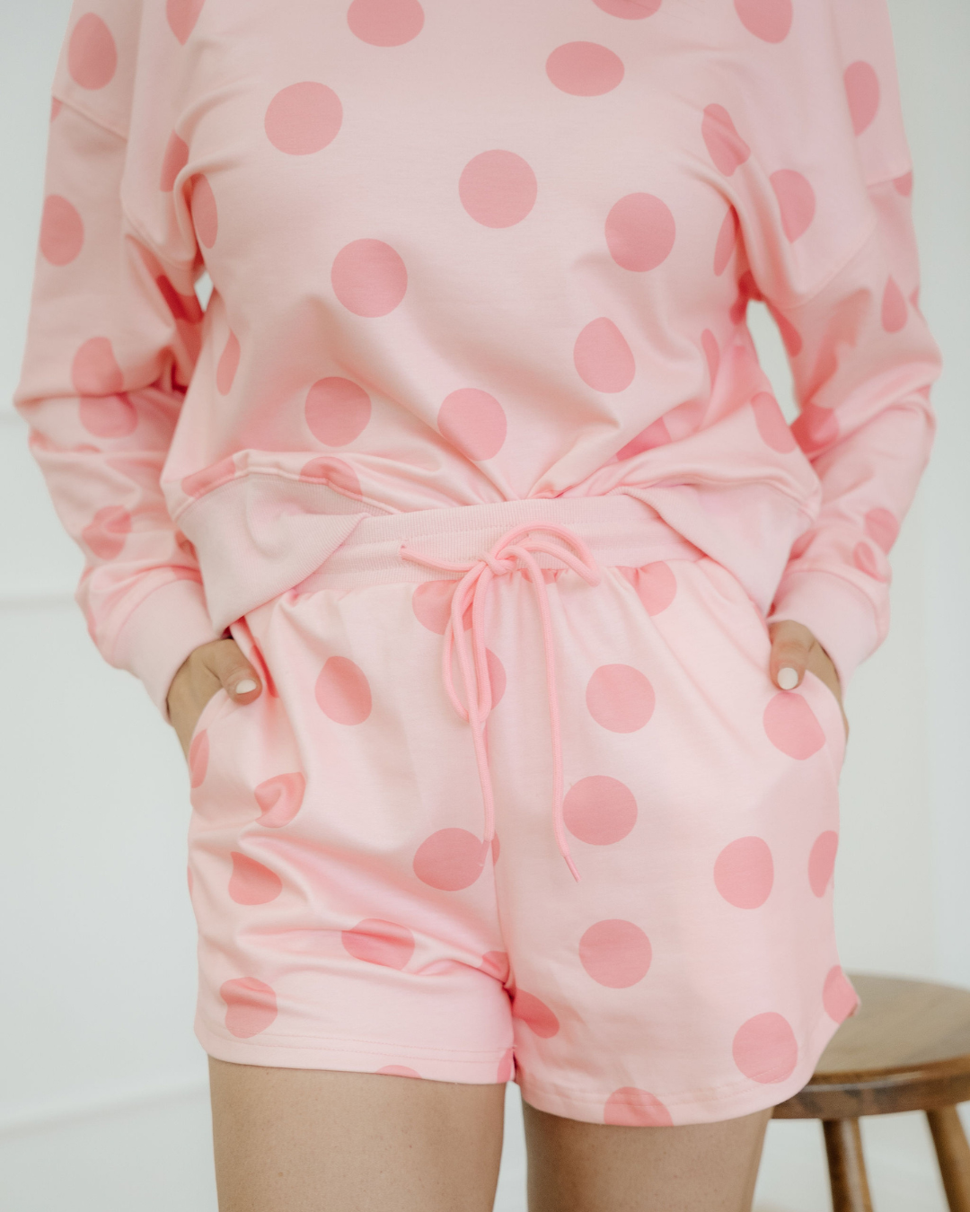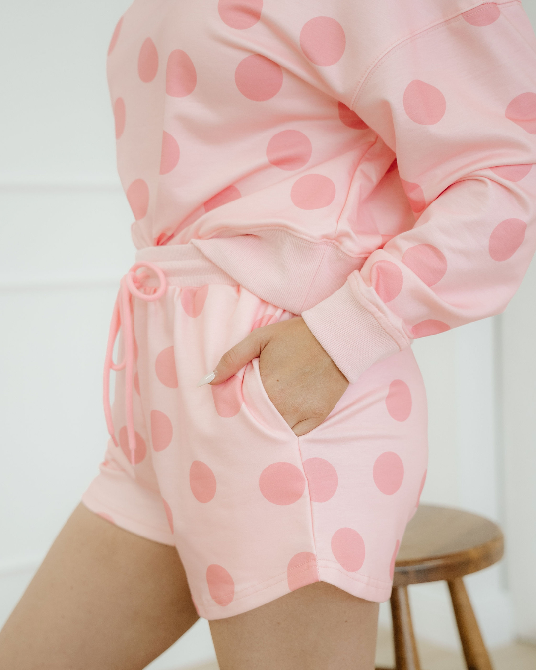 A versatile polka dot lounge set that pairs easily with sneakers or slides.