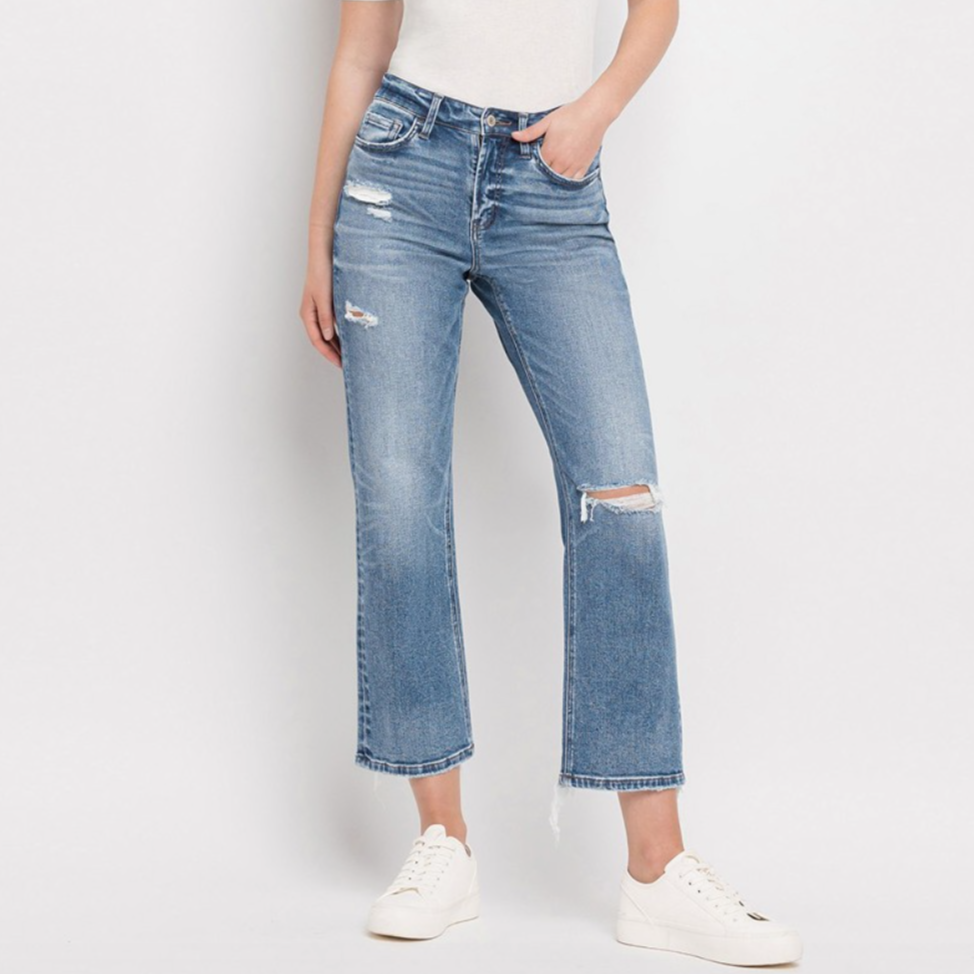 COMFORT STRETCH DENIM, HIGH RISE WAIST, DISTRESSED DETAIL, DISTRESSED HEM, CROPPED LENGTH, STRAIGHT JEANS