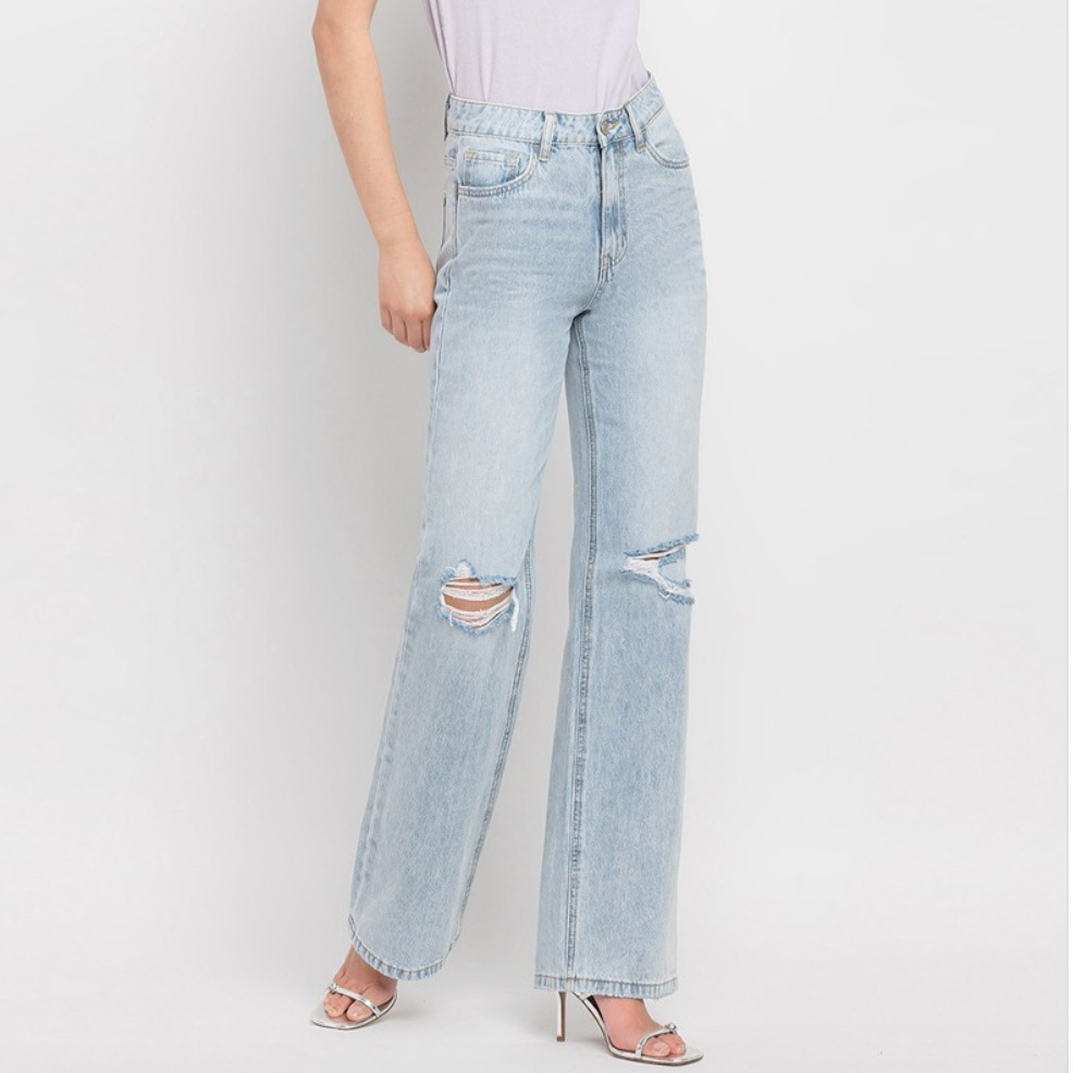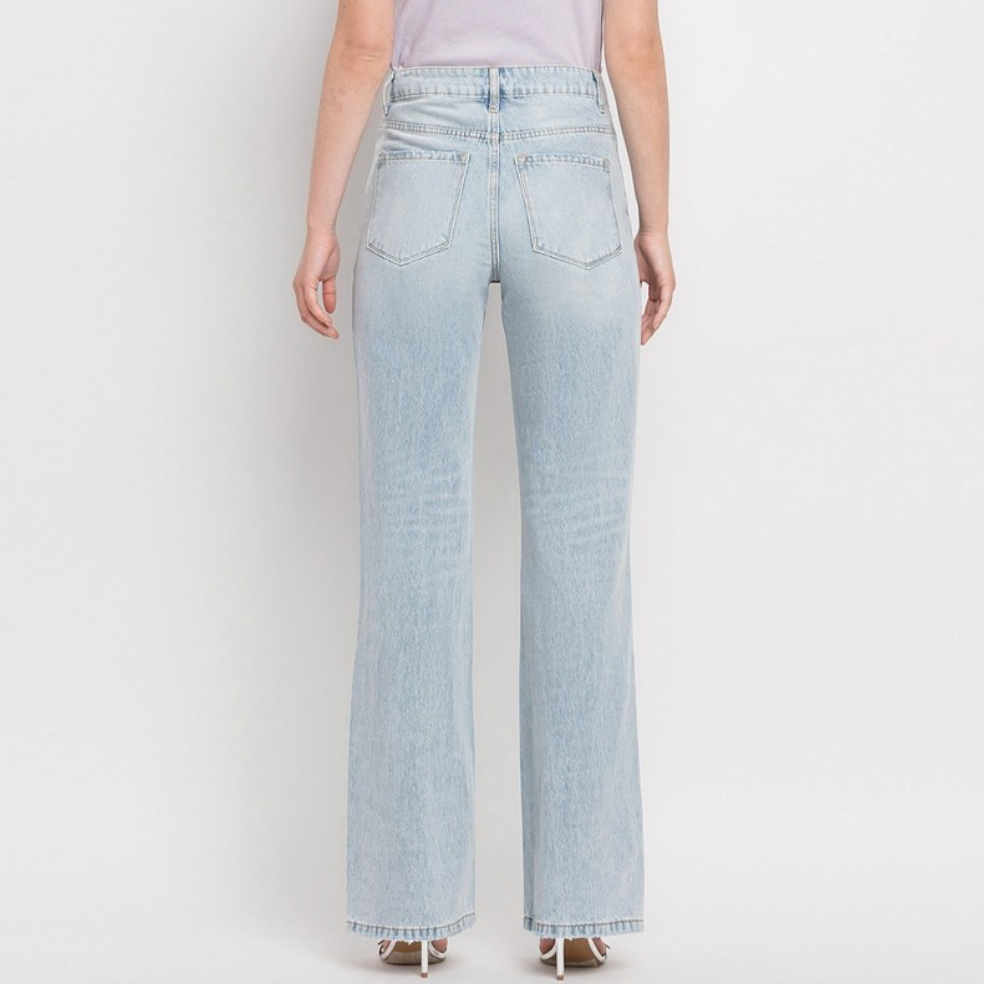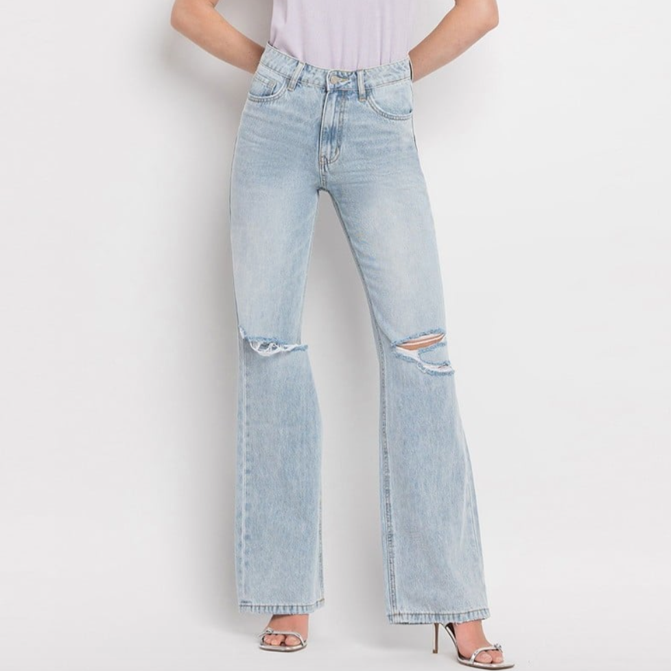 NON STRETCH DENIM, SUPER HIGH RISE WAIST, 90'S VINTAGE STYLE, DISTRESSED DETAIL, FULL LENGTH, FLARE JEANS