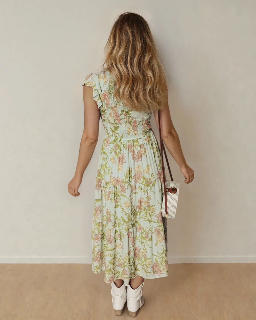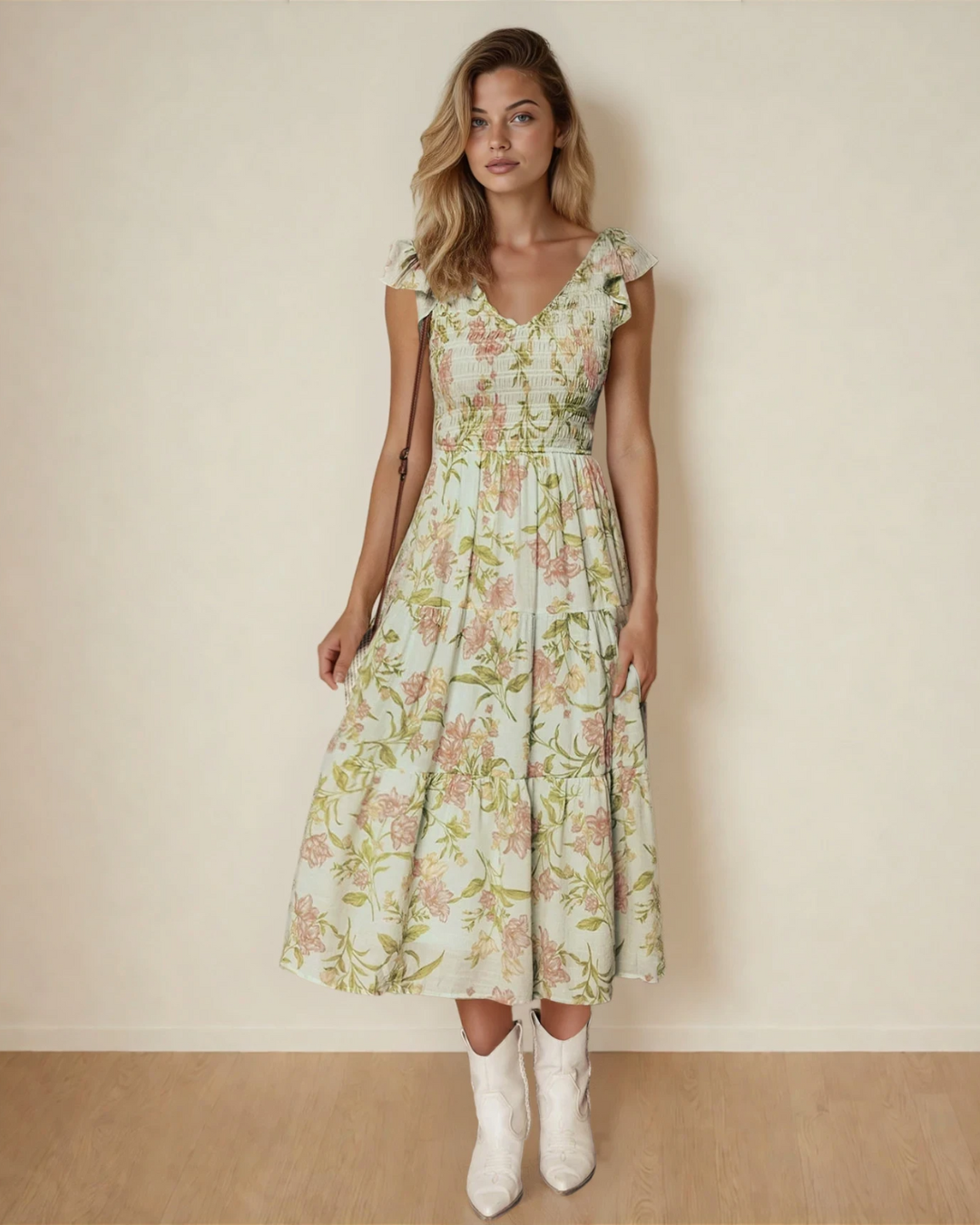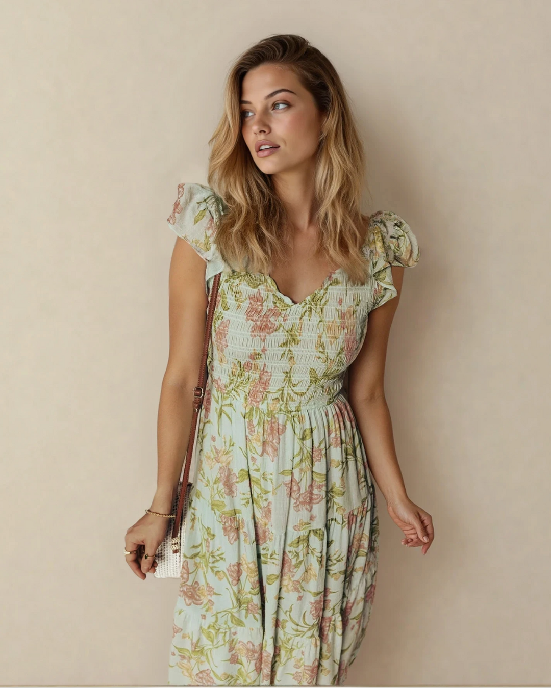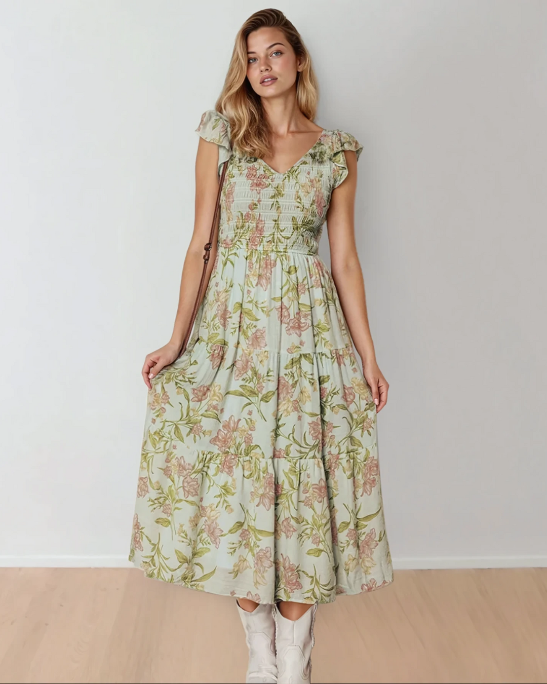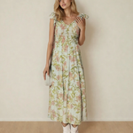Tiered floral maxi dress creates a flowy, elegant silhouette.
